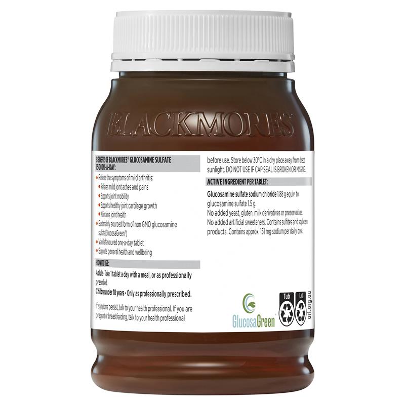 Blackmores Glucosamine Sulfate 1500 One-A-Day là một loại có hương vị vani, dùng một liều mỗi ngày của dạng glucosamine sulfate không biến đổi gen có nguồn gốc bền vững (GlucosaGreen®). Nó làm giảm các triệu chứng viêm khớp nhẹ bao gồm đau nhức khớp nhẹ, giúp duy trì khả năng vận động của khớp, hỗ trợ sự phát triển của sụn khớp khỏe mạnh và duy trì sức khỏe của khớp.