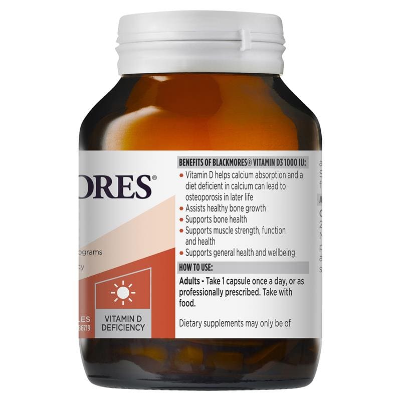 Hỗ trợ sức khỏe cơ bắp, hệ thống miễn dịch và xương của bạn với liều dùng một lần một ngày. Uống viên Blackmores Vitamin D3 1000 IU để bổ sung Vitamin D hàng ngày cho bạn. Công thức này có thể hỗ trợ xây dựng và duy trì xương khỏe mạnh. Vitamin D3 giúp hấp thụ canxi và hỗ trợ sức khỏe hệ thống miễn dịch và cơ bắp khỏe mạnh. Blackmores Vitamin D3 1000IU, chứa Vitamin D3 giúp xương hấp thụ canxi. Người lớn: Uống một viên mỗi ngày một lần để chăm sóc cơ, xương và khả năng miễn dịch của bạn.