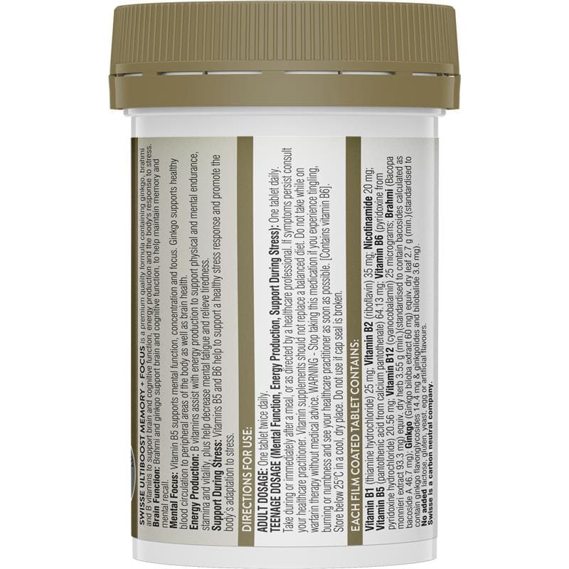 Swisse Ultiboost Memory + Focus chứa ginkgo, brahmi và vitamin B để hỗ trợ chức năng não và nhận thức.
